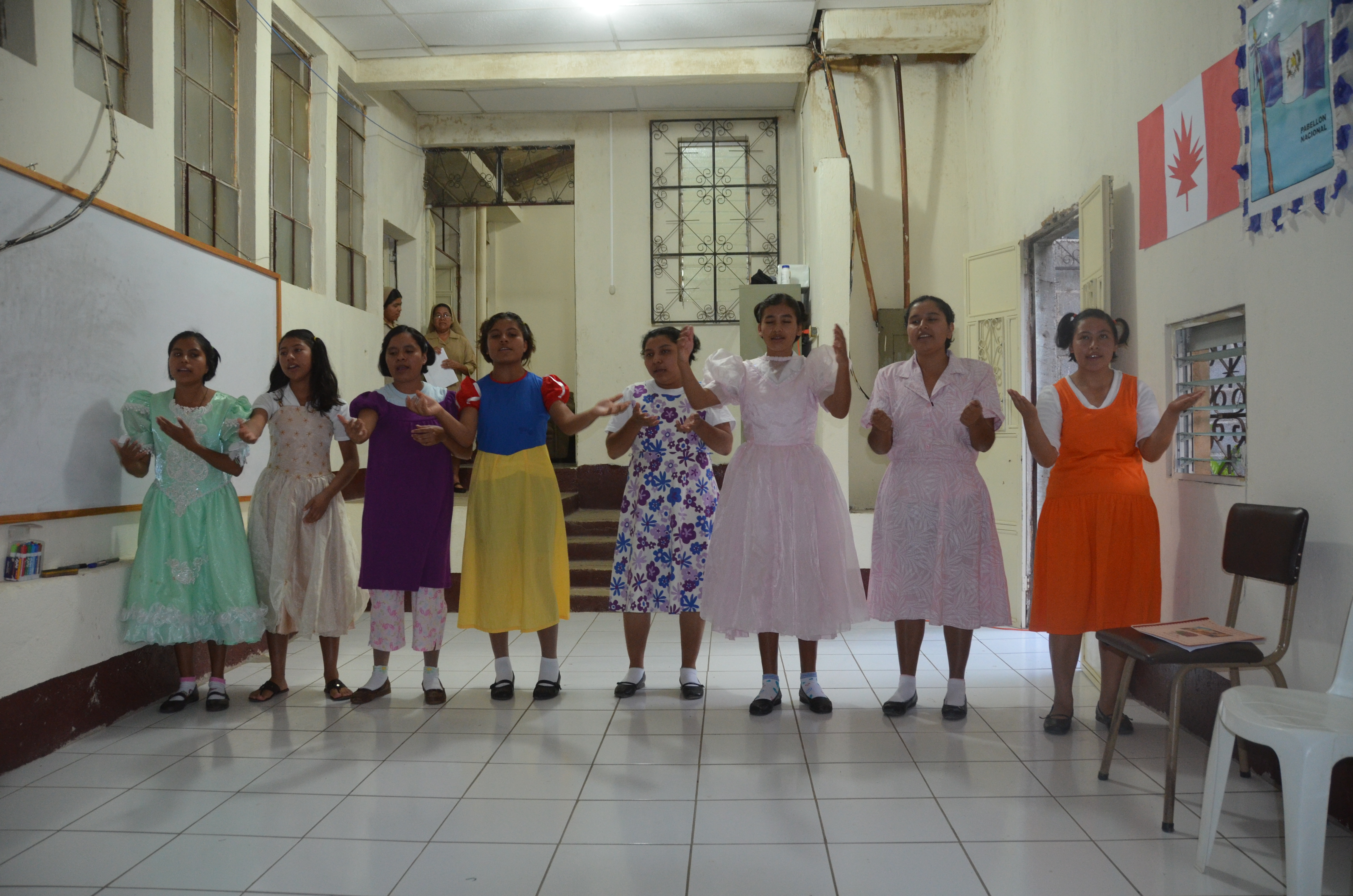 Last night was our ‘not goodbye’ party with the Hermana’s at the hospital. We arrived a bit early so Hermana Mercedes quickly ushered us into the dining room where we were not allowed to move so we didn’t spoil the surprises they had for us. When it was time we were ushered into the formal classroom that had been transformed into a “Grand Fiesta” (Big Party) room complete with a homemade Canadian Flag poster on the wall attached to a homemade Guatemalan Flag poster in a sign of true solidarity! How wonderful!