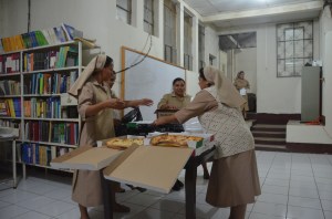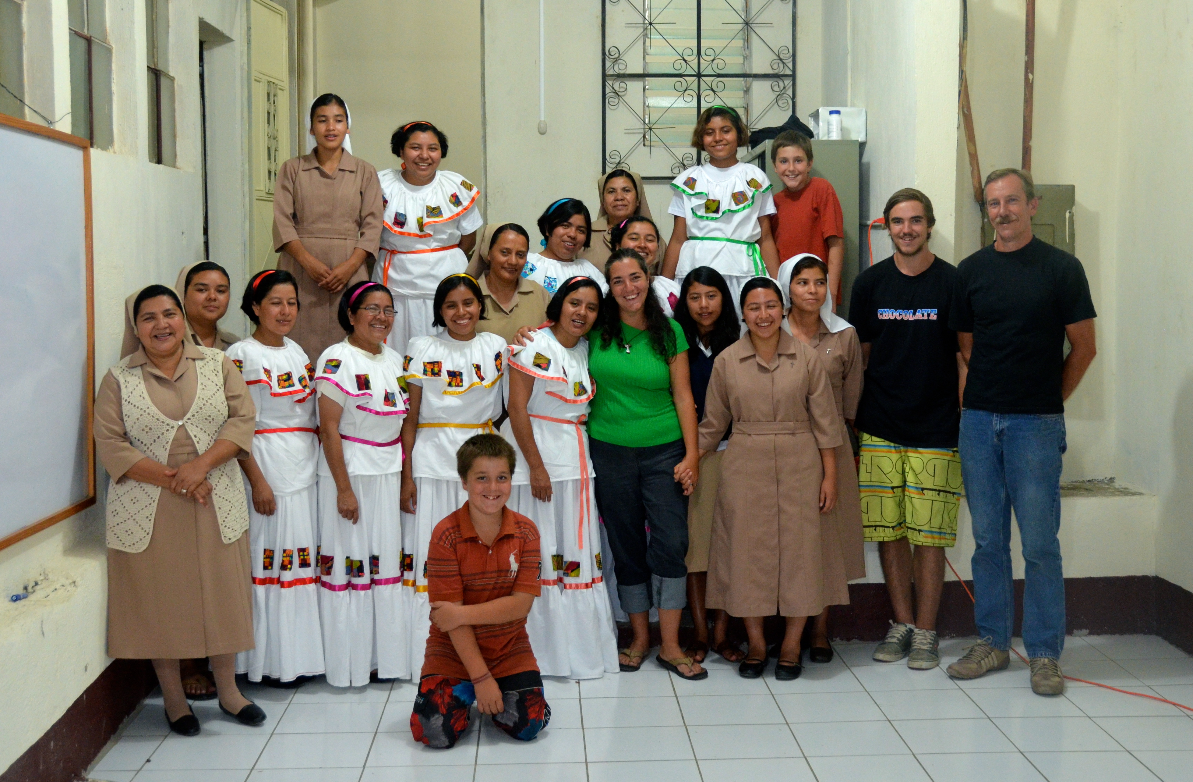The night began, we were all asked to stand, they all put their hands over their hearts and began with a heartfelt Guatemalan Nation Anthem. It is a long one… but it brought tears to my eyes to hear it and watch them sing it with such heart and pride for their country. The night progressed with a beautiful hand made booklet of songs and prayers that we could follow along in for the evening. What a great keepsake! Groups of Hermana’s and Novitiates came out in turn singing different songs, doing traditional Guatemalan dances etc. So much fun. Then dinner arrived, PIZZA! This is a huge deal here. No one orders food in the hospital. NO ONE. There is not money for that…. but this was a very special occasion and was treated as such. There were even 2 large Chocolate cakes from Florencia bakery in Jalapa over an hour away. Hermana Mercedes remembered us mention that it was Zack’s favourite cake. How special. During dinner some disappeared to get ready for the Grand Sopresa (big surprise). As we sat and waited we were all curious as to what was in store.