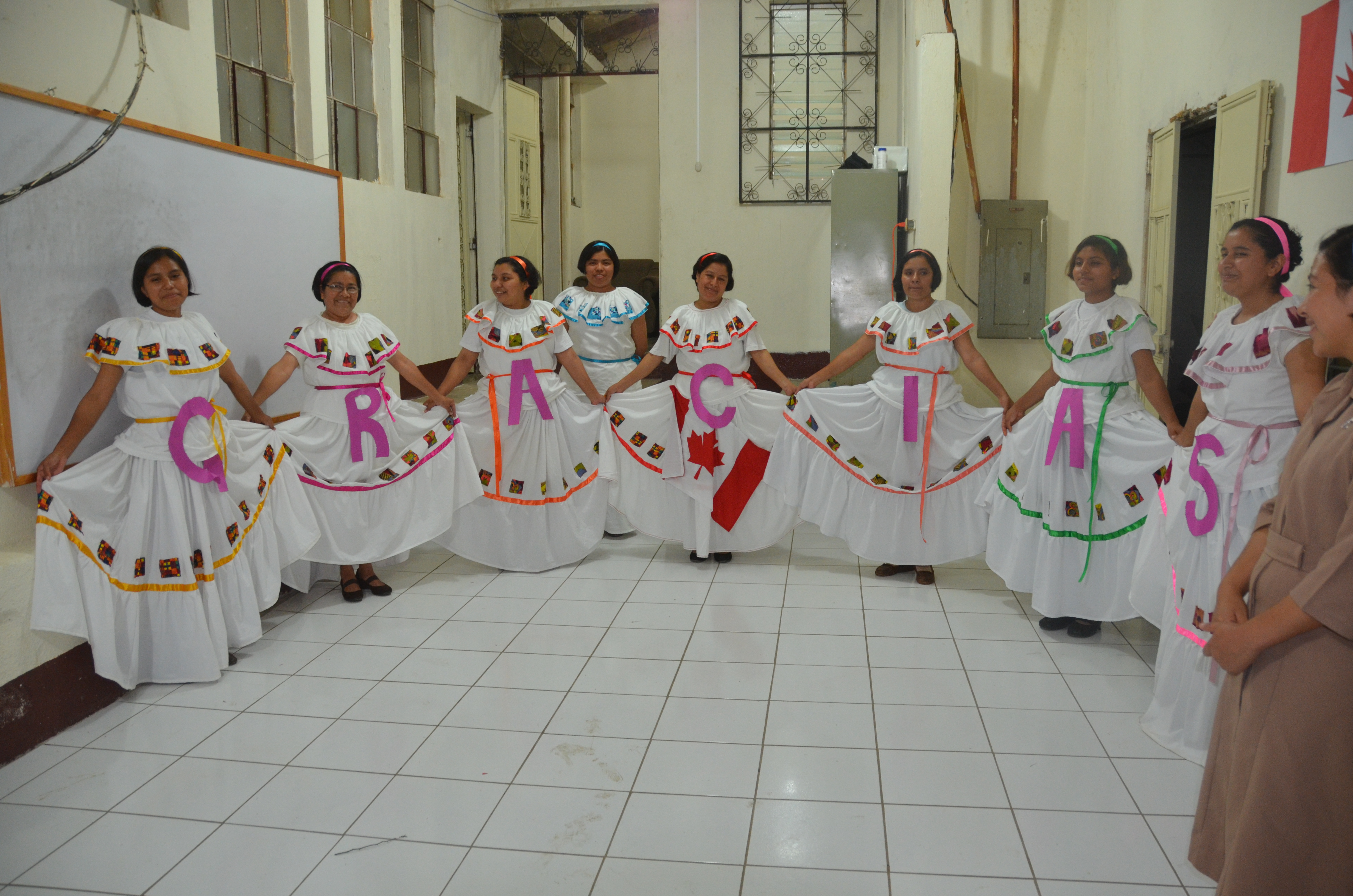 We were asked to stand and it began. Their hands went over their hearts in a show of respect and out of their mouths came…. “O Canada, our home and native land…..”…. Immediately tears came to my eyes. I need to explain here…. english is hard. Learning english is so incredibly difficult. I have been teaching english sporatically to these ladies for months and quite honestly they have learned very little. (A side note here, I have enrolled with Zack in a TESOL (Teaching English as a Second Language) certificate course and we will be offering classes full time next year here due to the huge demand. So many have asked so we will do). Anyway, as I was saying, pronounciation of english is so difficult. As I stood there, crying and trying to sing our anthem along with them, all I could think of was how long it must have taken these ladies, with their crazy busy schedules to learn our song…. By the end, most of them were standing with tears rolling down their faces…. but they had been faithful and completed the whole song. And it was time for them to move… they had their long skirts clutched to the side, folded across the front and with the last note of our anthem they dropped their hands, letting their skirts fall…. and there it was…. spelled out in huge letters across the front of them…. one simple word with a Canadian flag (homemade) in the middle…. “Gracias” (Thank you). That finished me and the tears flowed freely now. For them too. Hermana Mercedes began to speak…. they had all been narrating the evening with talk of our family (and Mateo)… and how we are an example to them etc etc. Hermana didn’t get far before the tears stopped her. Mostly all she got out was basically, “Thank you to your family, for your example… for your love… and to the people of Canada who bring love and hope… without you we could do nothing for the children…. “